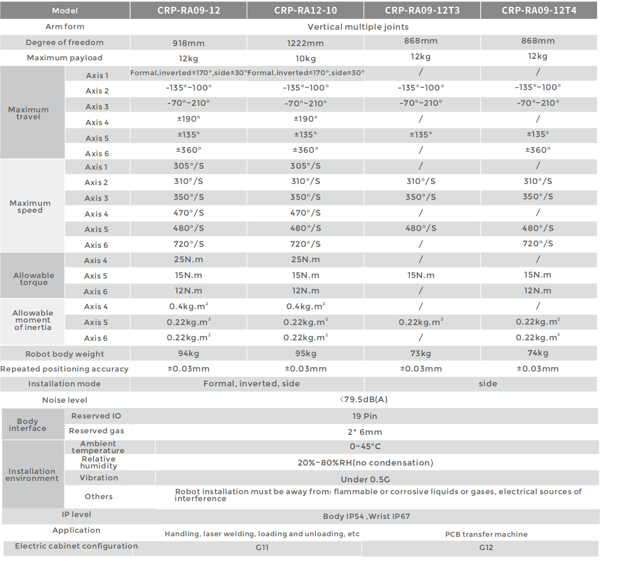 • High speed, high precision, higher efficiency.the whole body adopts all-aluminum body design, lighter quality than the same level of products, RA09-12 series relative to RA09-07 series operation speed increased by 30%, standard door trajectory 0.42s, repeated precision positioning accuracy 0.03mm, to achieve rapid effect, improve production capacity;